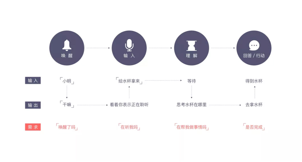 首先你要叫他的名字,如果他听到了会回答你“干嘛呀”或给你个眼神儿,这时候你知道他在听你说话,你可以继续说了-“给水杯拿来”。他可能需要想想水杯在哪或者问你,当他去拿水杯你会看到他正在行动。将与人的语音交互节点提炼出来,进行总结就是语音的交互框架: