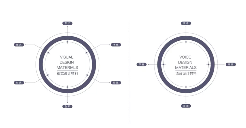 通过“色彩、材质、形状、版式、动效、字体”塑造视觉形象,用视觉形象反映产品气质、品牌理念是GUI设计师工作之一。人工智能赋予了机器拟人化声音输出的能力,带来的语音设计材料。不同的声音带给用户的感受是不大相同的,低沉的声音给人“稳重,成熟的”的感觉,尾音语调向上的声音给人“愉悦,被尊重”的感觉。